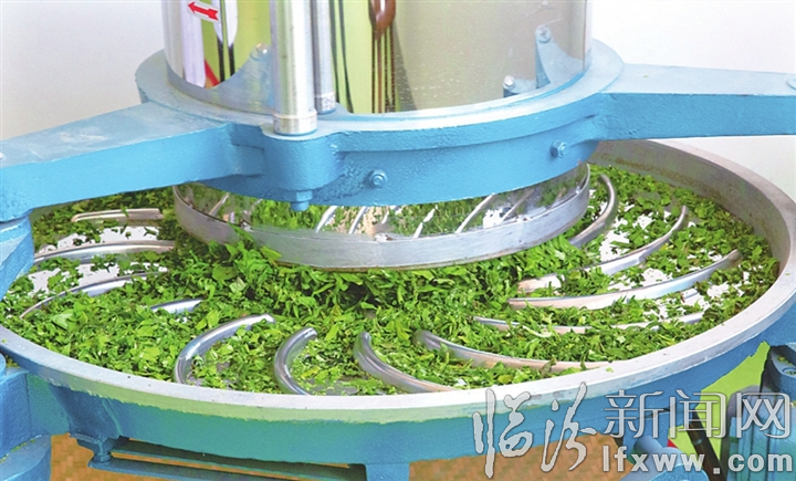 5月23日的翼城县桥上镇黄家垣村山西贸华农业科技有限公司,茶叶生产车间内一片繁忙,车间的加工机械正井然有序地加工着茶叶。一名工人正在往机器里添加新鲜连翘叶,这些鲜叶通过摇青机、揉捻机、速包机、平板机、松包机、烘焙等工序,就完成了纯正地道的连翘药茶的制作过程。