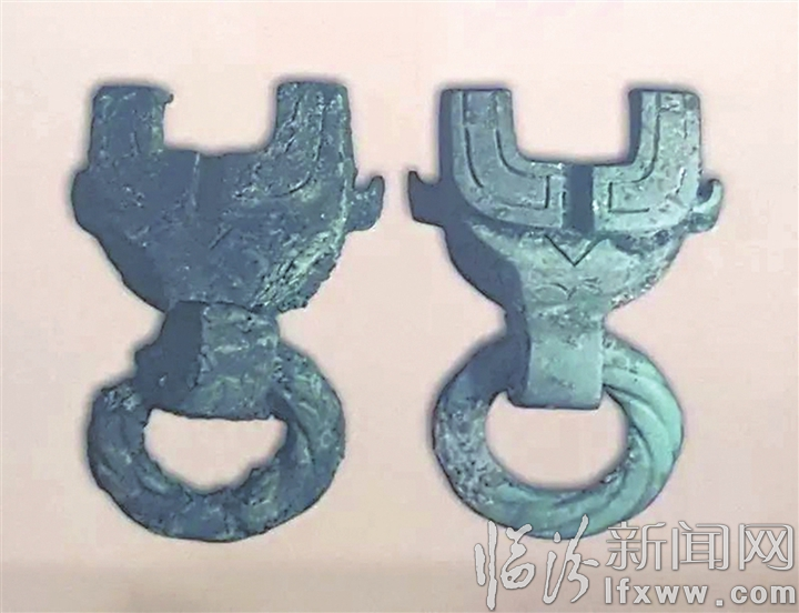 今天展示的这两件铺首,出土于晋侯墓地,铺首造型简单,兽首,嘴下衔有一个圆环,是棺椁上的饰件,共有四对八件。铺首衔环用在棺椁上,一方面是镇妖辟邪,一方面是有实际的功用,就是棺椁下葬的时候用以穿绳吊棺。