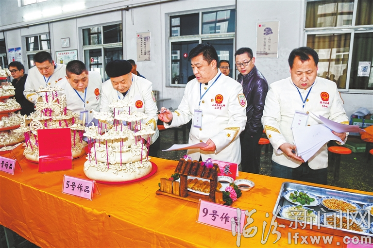 浮山厨师协会会长石防震带领评委给参赛作品打分