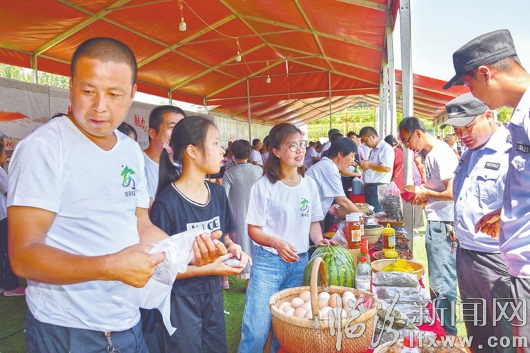 在农产品展销中,府城镇的农产品展销区也是人头攒动,连翘茶、绵核桃、木耳、佛手瓜等农副产品被搬到了产销区,通过“米袋子”“菜篮子”“果篮子”向社会各界展示了该镇的特色农产品。