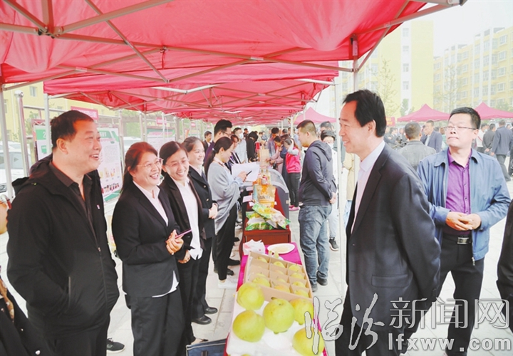 市人大常委会副主任、汾西县委书记任天顺在展销会现场询问农产品市场前景