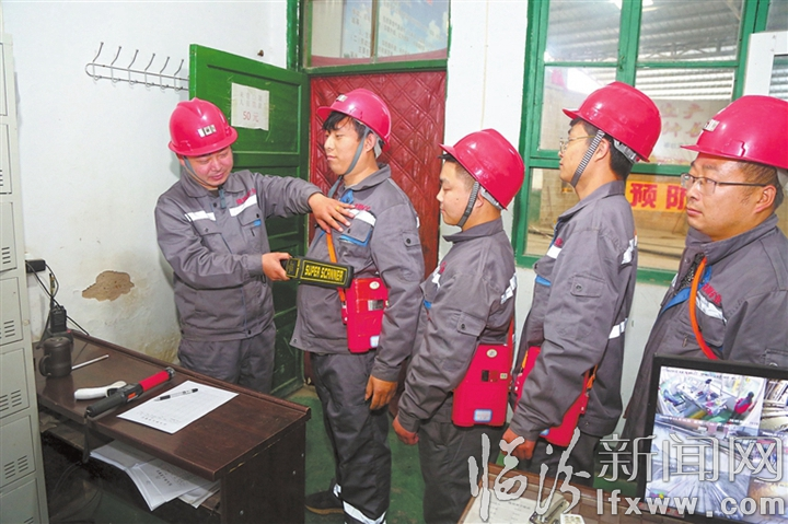 浮山县隆顺矿业有限公司工人正在进行出入井检查和酒精体温测试