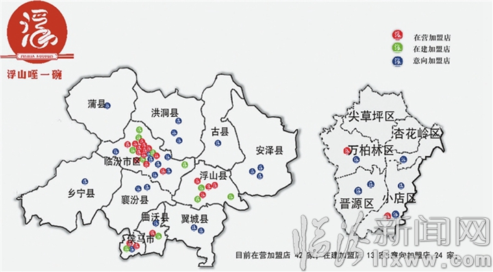 坚持标准先行、市场运作,确保老浮山拨面加盟店有序推进。制定了门店装修、品牌标识、服装服务、制作工艺、产品标准、同地域价格、管理模式、宣传营销等老浮山拨面加盟店“八统一”加盟标准;规范了老浮山拨面加盟店菜品面品行业标准;研究出台了老浮山拨面加盟店补贴标准。成立了浮山县厨师品牌推广有限责任公司。以浮山朋聚源店为样板,对各加盟店进行现代餐饮系统管理,实行星级评价考核。目前在营加盟店42家;在建加盟店13家;意向加盟店24家,辐射太原、临汾、浮山、侯马、翼城、曲沃等地,预计年内发展到100家。通过加盟店的市场实践,有效打破了以往从厨求量不讲质的传统观念,打破了以往个体独创不加盟的品牌意识,打破了以往标准零乱不规范的管理模式,打破了以往产品粗放不精细的营销格局,打破了以往发展单一不全面的市场体系。