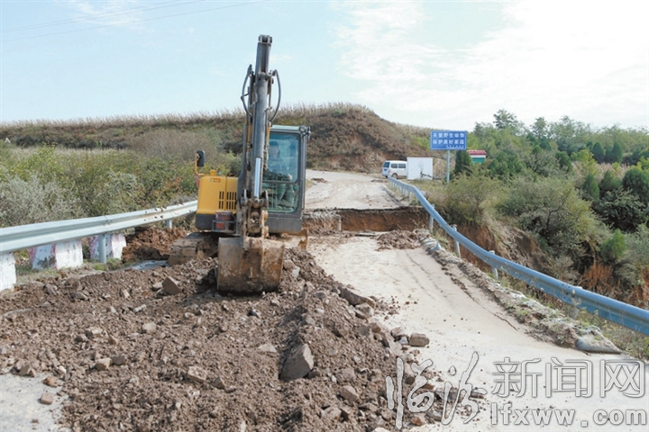 车行河闫线上,“前方路段危险”的警示标识不时跃入眼帘。在K10+600处,一台挖掘机正往来反复,紧张地作业着……