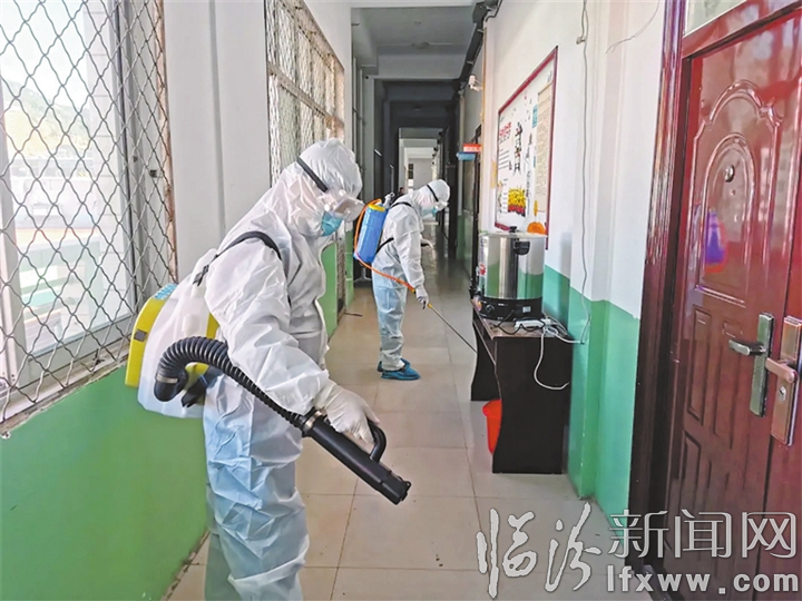 ▲近日,永和县疾控中心组织业务人员在县城安置点对场所、环境进行消杀,为安置点人员测体温、量血压。
