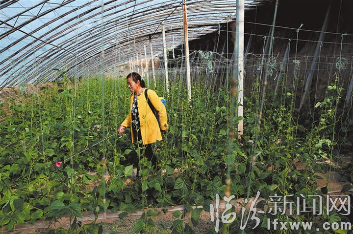 近年来,蒲县薛关镇薛关村立足当地实际,大力发展设施蔬菜产业,积极引导农民种植大棚番茄、黄瓜、豆角等反季节蔬菜,让村民们的“钱袋子”鼓起来。如今,设施蔬菜大棚已成为农业增效、农民增收的绿色产业,蔬菜大棚也托起了薛关村村民的致富梦。图为村民正为大棚蔬菜喷洒营养液。