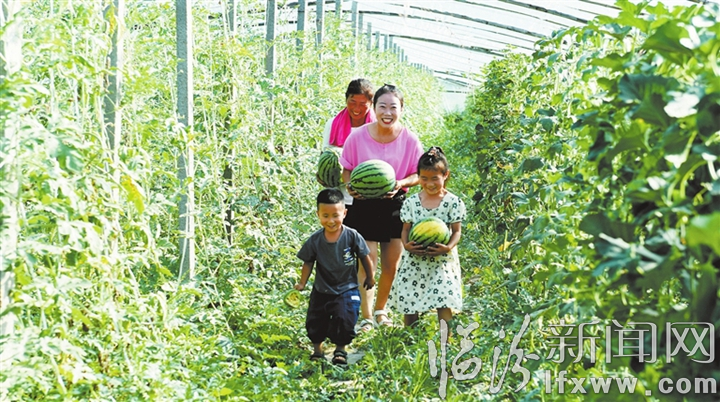 桑梓村大棚瓜果基地喜获丰收,游客在瓜田内采摘西瓜,到处是欢声笑语。
