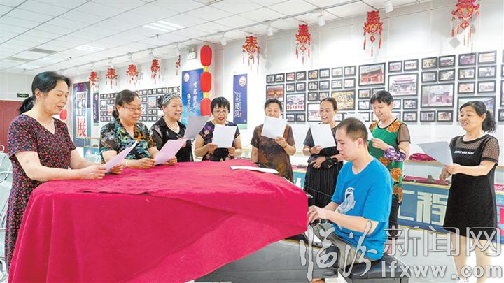 县文化馆合唱团团长贺素萍一手飞快地在钢琴黑白键上弹出音符,一手在空中有节奏地打着节拍,带领团员们跟着节奏演唱。平均年龄在60岁以上的合唱团成员们精神抖擞、热情满怀,唱响新时代赞歌,唱出了幸福生活比蜜甜的无比喜悦。