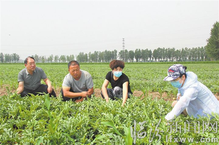 近年来,侯马市西瓜产业发展势头良好,种植面积逐渐增大,今年,西瓜种植面积预计达到2000余亩,销往周边各县市及西安等地,将有效增加农民的收入。眼下露地西瓜进入后期管理的关键时期,侯马市农业农村局农业技术人员及时走进田间地头,送科技、送技术,帮助农民进行田间管理。图为农业技术人员在张村办观庄村西瓜种植户的田间进行技术指导。