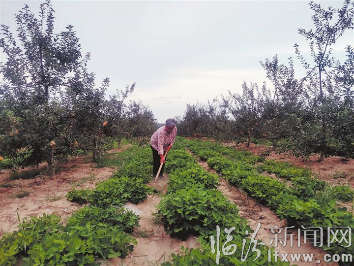 在村民贺广定的苹果园里,贺广定的爱人、66岁的陈根花正在锄草,望着长势喜人的花生,陈根花高兴地告诉记者:“这12亩果园里都是苹果幼苗,在果树结果前,通过套种花生每年都可以有收益,因为我们采取了新技术,果树间距较大,就算是果树长成了,也不影响花生的采光,还可以继续种花生,像我们这样的年龄,伺候好一块地,就能有2份收入,实在是好事啊!”