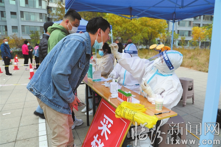 “大家请扫场所码,排好队做核酸了!”“保持一米线距离,不要扎堆儿,不要扎堆儿!”“张嘴、抬头,啊——”7点35分,在志愿者的帮助下,家住大众路的张大爷做完了核酸采样。