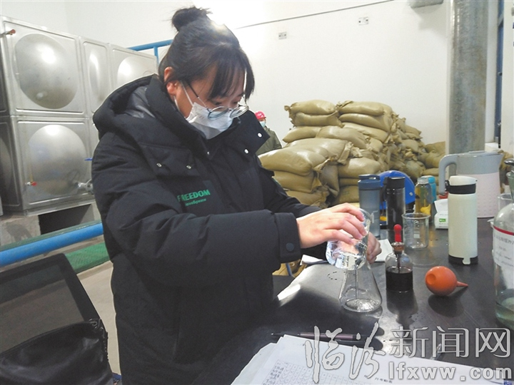 走进热源厂化水车间时,检验员兰晓苗正在用量杯从热源管道打开的水龙头处接水,并拿到试验台进行化验。“我的主要工作是对水处理设备和化验药品进行全面检查,及时、准确地对生水、软水和储水进行化验分析,并详细做好记录。”兰晓苗表示,“作为热源厂的一名职工,一定会尽职尽责,做好本职工作,确保供暖设备正常运行。”