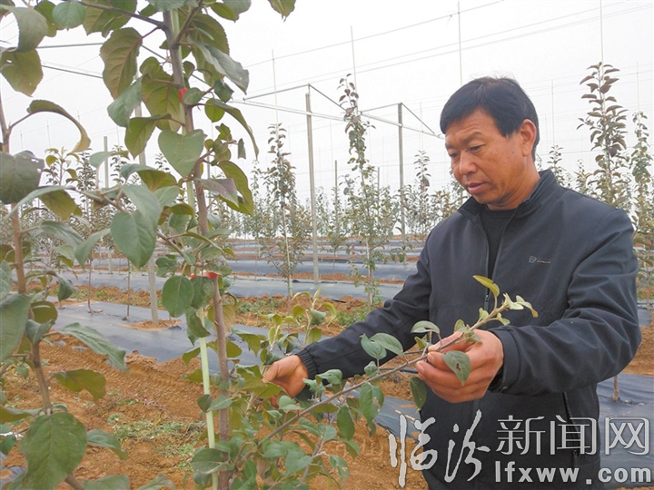 吉县苹果高新科技示范园技术负责人王刚岭查看矮化密植果树生长情况
