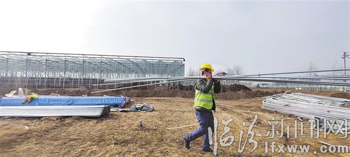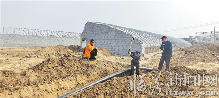 初春时节,在尧都区屯里镇沟上村乡村振兴示范村建设项目施工现场,一排排蔬菜大棚的钢制龙骨架在阳光下折射出耀眼的光芒;齐整整的田野上,工人们正在把给水管道埋进挖好的壕内,随后进行填土作业。