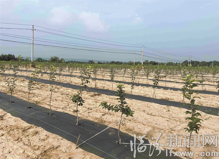 站在山中乡白家庄村的百亩果园地垄处,一排排“秦脆”品种苹果树枝叶繁茂,三千余米的引水管道直达地头,由牛场提供的肥料整齐堆放。