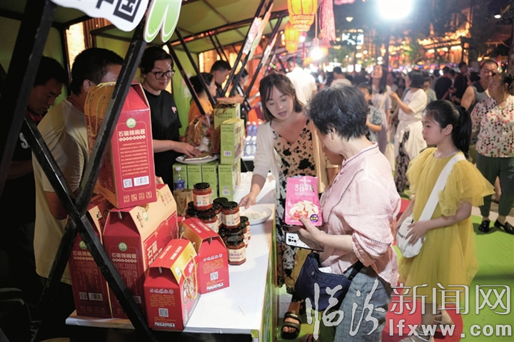 苹果礼盒、冻干柠檬、苹果脆片、石碾辣椒酱、益生菌发酵果汁、花生油、菊花茶……来到位于财神楼街道的农特优产品展位,各式各样的农产品琳琅满目,让人目不暇接。叫卖声、解说声此起彼伏,各参展企业的工作人员花式推介当地农产品,忙得不亦乐乎。大家以小小展位为窗口,助优质农产品走上更广阔的舞台。