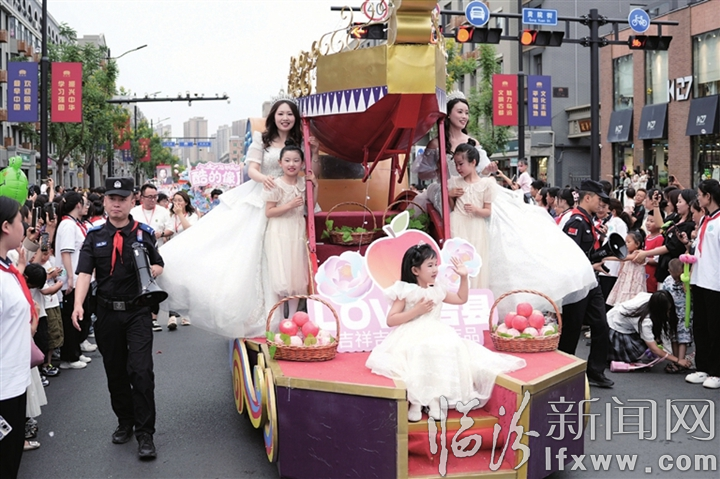 丰富多彩的特色美食令人垂涎欲滴,活泼跃动的“苹果滑板”方阵令人拍手称赞。“童梦飞扬·吉果飘香”的小苹果方阵由1名领队、25名儿童和10名老师组成,孩子们身着苹果造型服装,灵动活泼的造型辅以蛙式滑板车的奇幻灯光,与老师们装扮的人偶随着迪士尼假面花车一同前行,以舞蹈串烧形式,演绎了《小苹果》《梦想家》《童年》等曲目,深受广大市民的喜爱和追捧。所到之处,赞誉声一片。