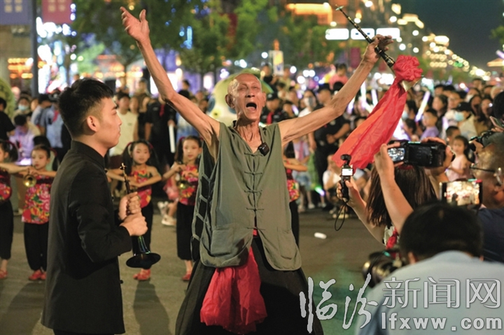 “快看,这位吹唢呐的老人已经80多岁了……”透过熙攘的人群循声望去,一位精神矍铄的老人正全神贯注地吹奏着唢呐经典曲目《百鸟朝凤》,在演奏的同时,他还不忘与年轻一辈的唢呐爱好者、孩童热情互动,悠扬的唢呐声吸引了周围群众驻足欣赏,“四世同堂”的唢呐表演令观众频频叫好。