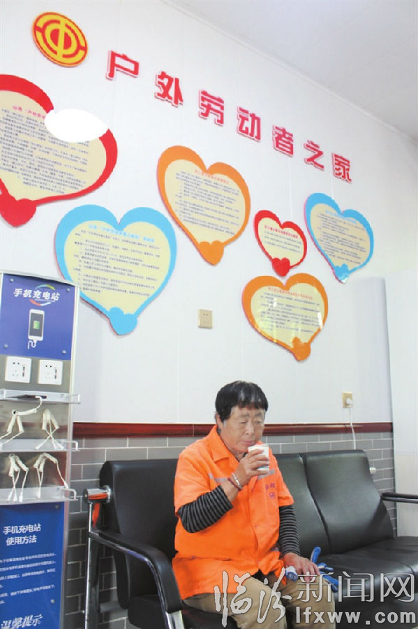 王平平从事环卫工作已经有十几年了,以前都是随身带水杯,渴了在路边的摊位上接点水喝,有时拿点饭食,坐在树荫下随便扒几口。现在在驿站,不仅冰箱、药品、饮用水齐全,还配备了手机充电设备,让王平平感觉就像回到了家,很放松。