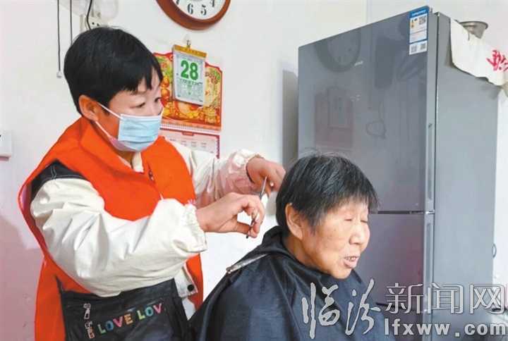 爱驻临钢”重阳节专项关爱活动,为辖区内80岁及以上高龄老人送去贴心服务与节日温暖。图为志愿者为老人免费理发。