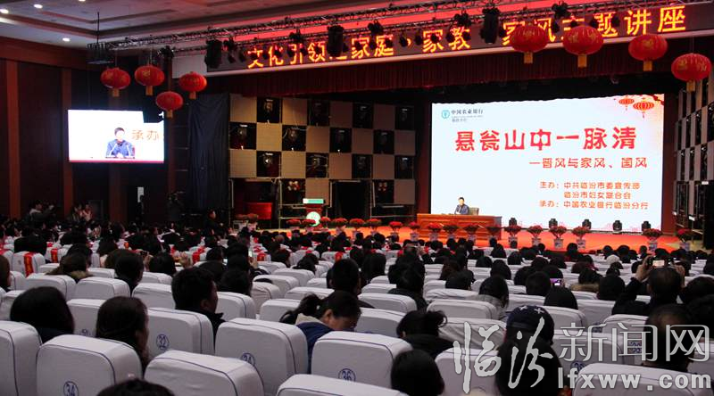 2月13日,由市委宣传部、市妇联联合主办,中国农业银行临汾分行承办的“晋风与家风、国风”专题讲座开讲。讲座邀请中国古典文学与文化专业博士、中央电视台《百家讲坛》栏目主讲人郦波为大家讲授。市委常委、军分区政委王振富,市人大常委会副主任王金珍,副市长潘海燕,市政协副主席梁清燕参加讲座。潘海燕为讲座致辞。