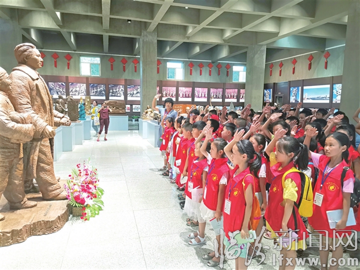 步入展厅,庄严肃穆的《牵手》雕塑屹立正中央、宽敞明亮的大厅挂满了图片、一件件象征红色文化的雕塑整齐陈列,犹如凝固的一部建国史诗让人仿佛穿越时空。“我们是共产主义接班人,继承革命先辈的光荣传统……”小记者们身着统一服装队列整齐,向伟大领袖毛泽东行少先队队礼,表达对伟人的崇敬之情。