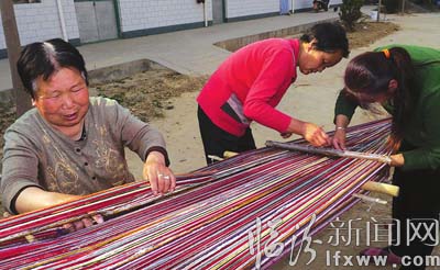 在织布机前,48岁的王爱香负责缠线,狐樱桃在中间梳理线的顺序,54岁的杨花巧在织布机转动的机轴上往线下垫放小竹棍,保证线的整齐有序。织布机一头的“托子”上压着一个铁盆,盆里放着两块大石头,还放着缠成球状的五颜六色的线。压石块是利用重力把要缠的线拉直。