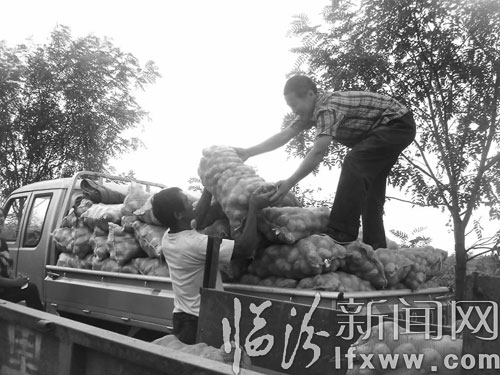 将“收获”的土豆装车,种植户、收购商都乐得合不拢嘴。