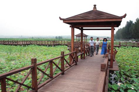 “我们高显镇有‘全国民间文化艺术之乡’的美称,高显村的农民书画在全省更是独树一帜。”荷塘边,翟剑指着不远处的木屋说,最大的那个木屋即是书画展厅,展厅内展出的作品有百余幅,都是以荷花为主题,由镇、村、学校、企业的书画爱好者创作。我们向右看,可以看到一座木桥,木桥西边是我们新扩建的生态水面,并且与原有的生态水面连接在了一起,我们可以感受到扩大后的生态水面与原有的小游园、莲藕区以及新建的水上乐园共同形成了一道亮丽的风景线。