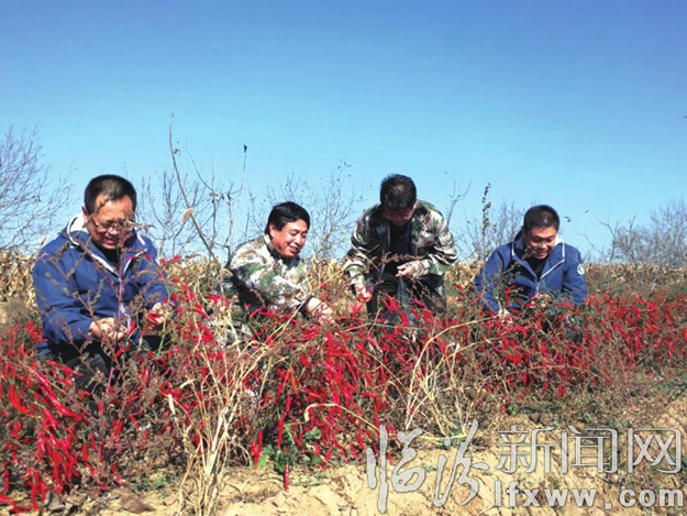 驻村工作队队员在辣椒基地为农户采摘辣椒。