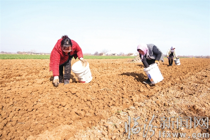 “咱们加把劲,争取早点干完今天的活!”在地里翻动铁锨的李偏亲,一边干着,一边指挥着大伙。农田另一头的村民正在分组进行着犁地松土、打坑播种、培土盖膜……
