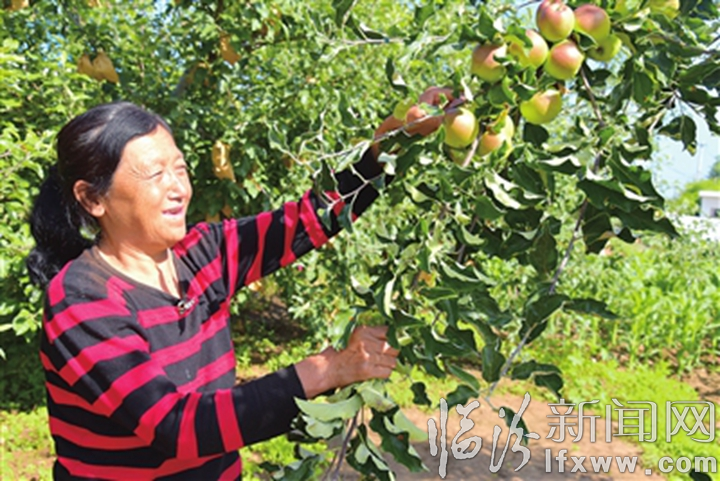 临汾新闻网讯 隰县阳头升乡岢岚金村共有农户161户,其中130户栽植果树,全村果树种植面积1230亩。近年来,岢岚金果农靠果树收入奔向小康。图为岢岚金村民在自家果园查看即将成熟的夏苹果。