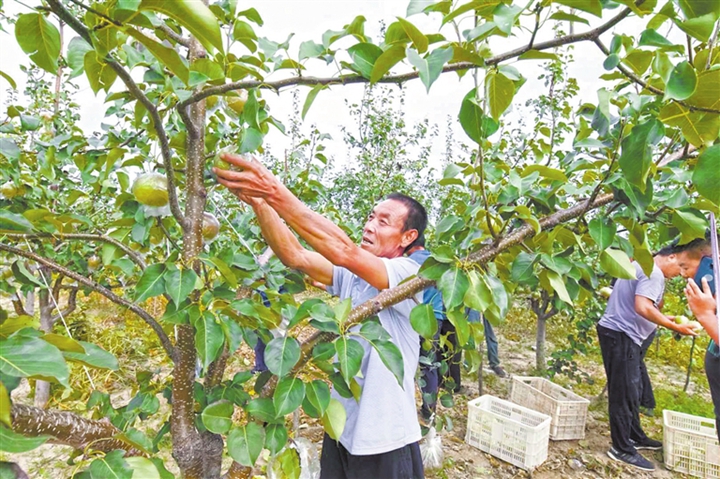 临汾新闻网讯 日前,隰县阳头升乡上河村的400亩玉露香梨喜获丰收,特级果地头价卖出了每公斤4元的好价钱。果农高兴地说,这得益于今年和地中宝果品种植合作社的充分合作,无论是技术指导还是果树管理,都本着科学的方法。图为果农正在采摘玉露香梨。