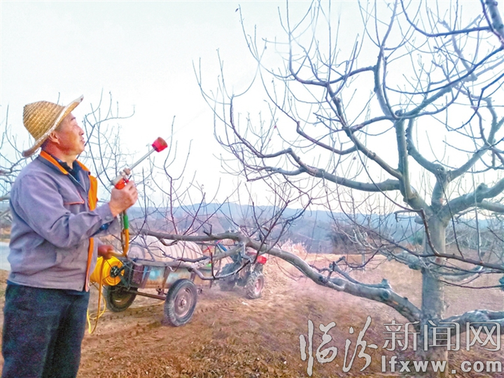 图为布业村果农曹建忠抓住当前果树管护的有利时节,给自家果园的苹果树喷洒农药