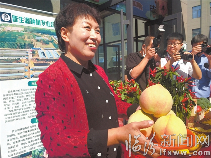 农产品展示展销一条街上,17个县(市、区)的县域展台前摆满了各类农特产品。在尧都区的展台前,“桃王九九”鲜桃特别引人注目。