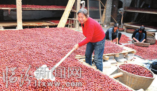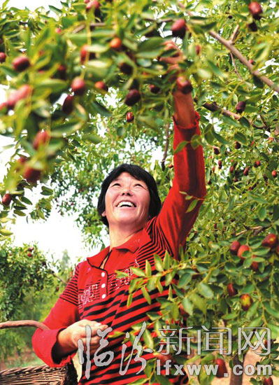官滩枣的栽培历史已有500余年,明清两朝作为“贡品”上缴皇宫。1997年“山西省干果经济林产品评奖展销会”将其评定为“山西十大名枣”。近年来,襄汾县加大农业调产步伐,结合当地优势,以官滩村为中心建设成万亩优质官滩枣基地。红枣产业已经成为村民的支柱产业,平均每亩纯收入达5000元左右。 (记者 闫锐鹏 通讯员 刘利平 摄)