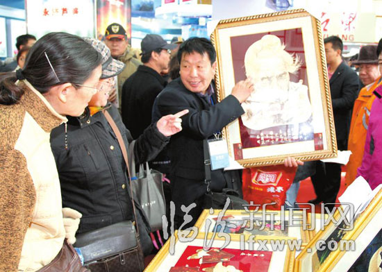 山西特色农产品北京展销周上,亢秀奎向人们展示他的作品《母亲》。