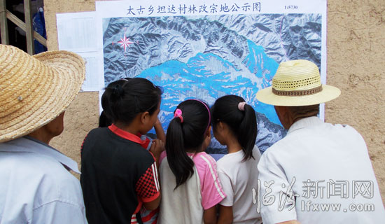 图为农民们正在林改宗地公示图上查看自己的位置。冯振兴 摄
