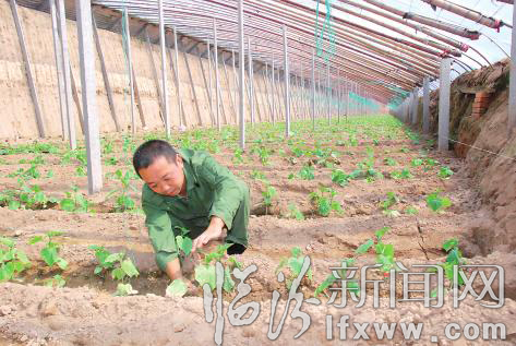 浮山县张庄乡现代农业示范园区内,菜农卫保军正在管护黄瓜苗。记者 范韶华 摄