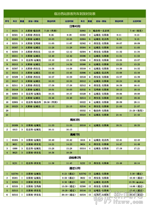 临汾新闻网讯 (记者 郝海军 姚建) 6月27日上午,记者第一时间接线大西高铁临汾西站证实,官方版《临汾西站旅客列车到发时刻表》已经公布。下面是本网编辑赶制出一份时刻表,以方便大家参阅。