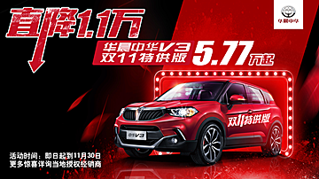你的梦想,中华买单!本次华晨中华V3“双十一特供版”以超值震撼价格圆你有车梦。