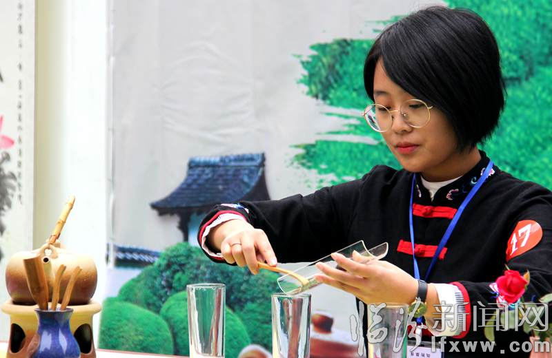 伴着古典清雅的音乐,身穿茶艺服饰的选手依次登台角逐茶艺,各显身手:备具、端盘上场、布具、赏茶、温盖碗、置茶、冲泡、温盅及品茗杯、分茶、奉茶、收具、端盘退场的茶艺程序表演。一双双巧手在精致的茶席间流转,优雅的手法沏出一杯杯清香热茶。令在场观众及评委眼前一亮,仿若置身古风茶韵,尽显茶道风雅。
