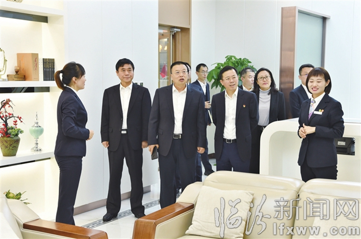 省联社党委委员、副主任刘延辉(左三)在尧都农商行调研。付华耀 摄