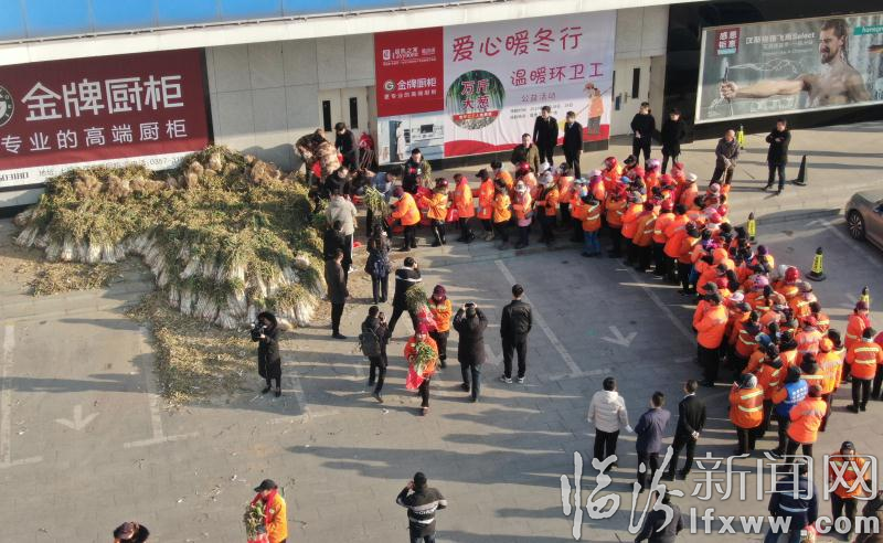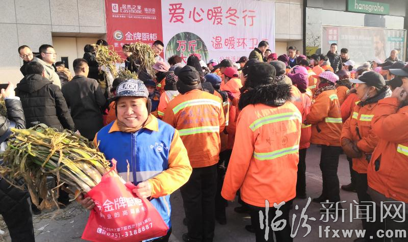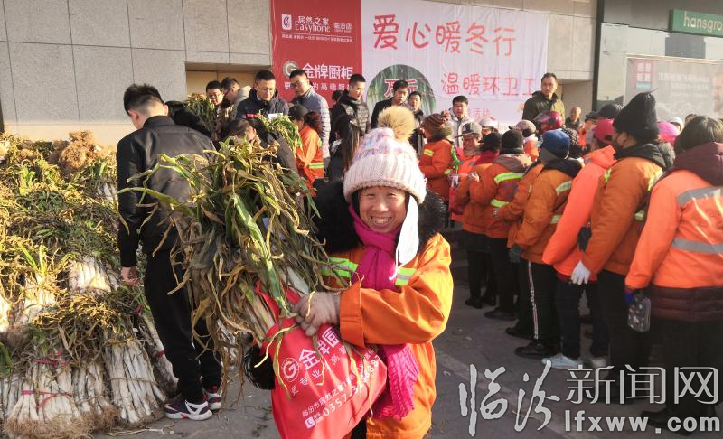 当日虽是隆隆寒冬,但是来自临汾开发区一线的环卫工人们心里暖意浓浓。现场,爱心企业居然之家金牌厨柜的工作人员将一捆捆大葱分发给现场300余位环卫工人。
