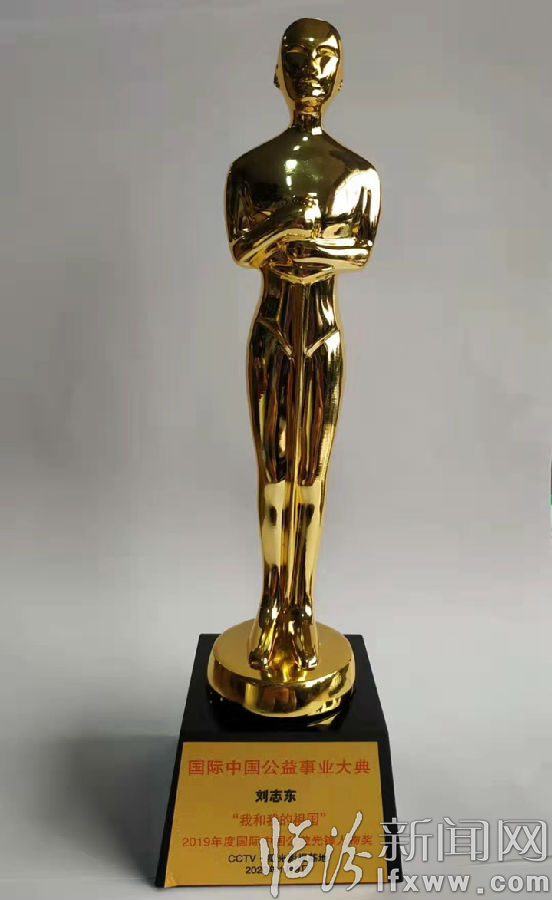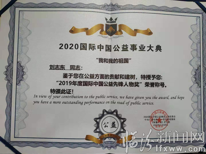 “鉴于您在公益方面的贡献和建树,特授予您:‘2019年度国际中国公益先锋人物奖’”荣誉称号。”