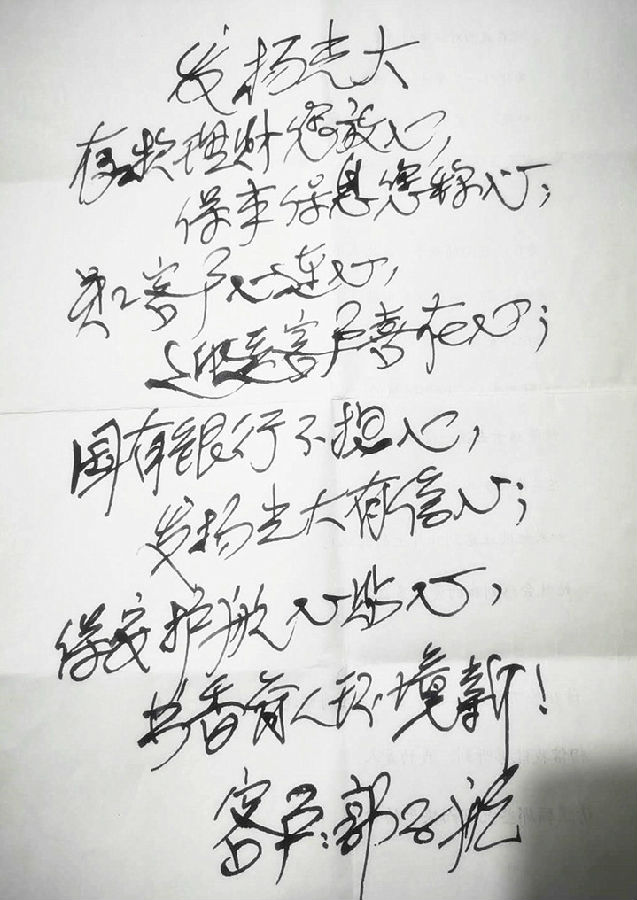 得知银行正常上班,专门将这首诗送来表示感谢。