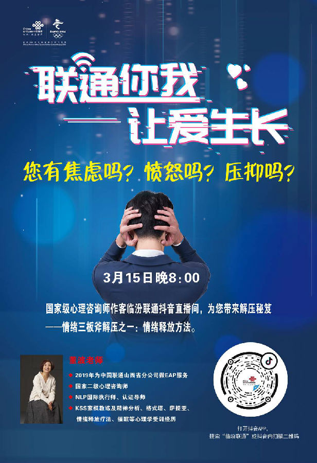 3月15日晚8:00,国家级心理咨询师作客临汾联通抖音直播间,为您带来解压秘笈——情绪三板斧解压之一:情绪释放方法。