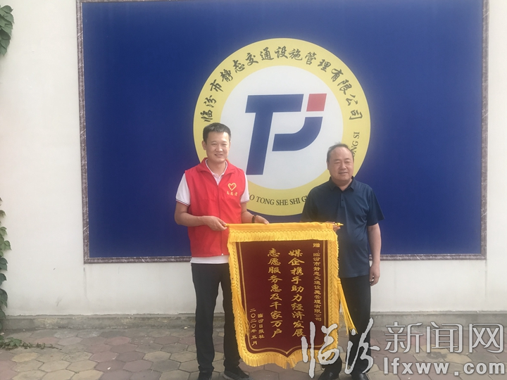 临汾新闻网讯 6月1日下午,临汾日报社志愿者服务队负责人赵玉峰将印有“媒企携手助力经济发展 志愿服务惠及千家万户”的锦旗送到临汾市静态交通设施管理有限公司董事长贾永波的手中,衷心感谢该公司在助力宣传我市“庆五一 惠民生 悦生活 5000万元消费礼包大派送”系列活动中给予的大力支持。