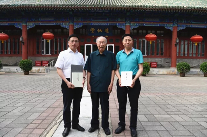 ▲原国家教育委员会副主任、总督学柳斌(中)向中师陈列馆捐赠其著作的《改造我们的教育》《柳斌谈语文》《心航集—柳斌诗词》《题赠墨迹》等书籍、作品