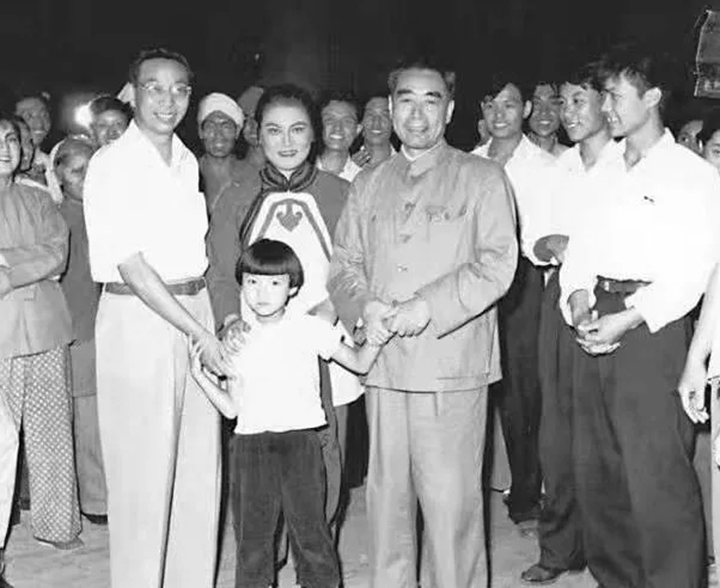 ▲著名外交家、翻译家、江苏东台母里师范学校(东台师范学校前身)校友戈宝权先生(前排左一),于1950年在北京陪同周总理(前排右一)观看演出后与演员合影(原江苏省东台师范学校校长崔一良投稿)